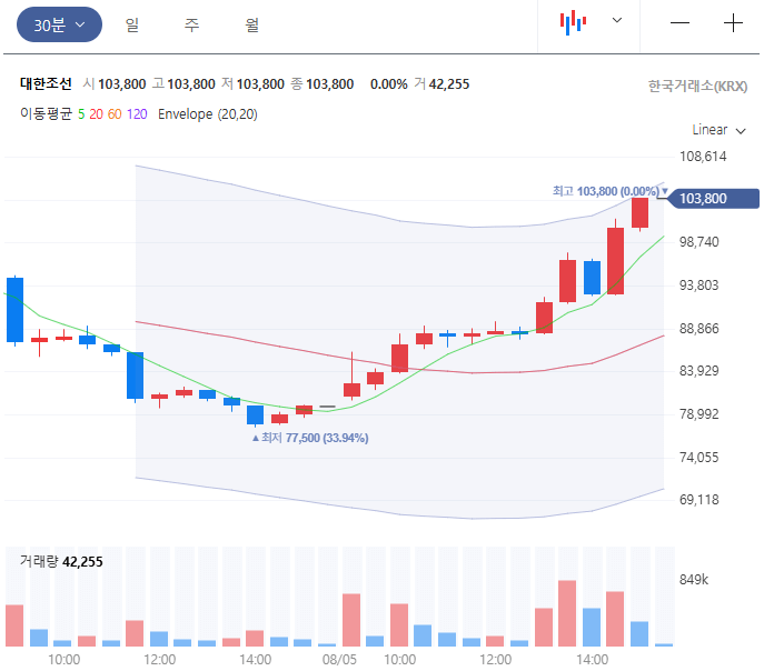 신규 상장주의 경우 상반된 두가지의 흐름을 보여줍니다. 상장가격 보다 오르면서 상승 추세를 이어가거나, 첫 몇일 동안 Exit 하는 물량이 나오면서 하락추세에 들어서게 됩니다. 대한조선이 오늘의 상한가 부근에서 몇일 조정 후 재반등을 보여줄지 지켜봅시다.