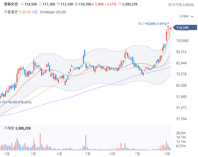 한화오션의 상승세가 가파릅니다. 조정이 오는가 싶더니 어느새 신고가를 기록하고 있습니다. 조선섹터의 대장주로 섹터 전체를 견인하는 모습입니다. 상승세가 언제까지 지속될지, 얕은 조정이라도 매수의 기회로 삼아야 할 지 살펴보겠습니다.